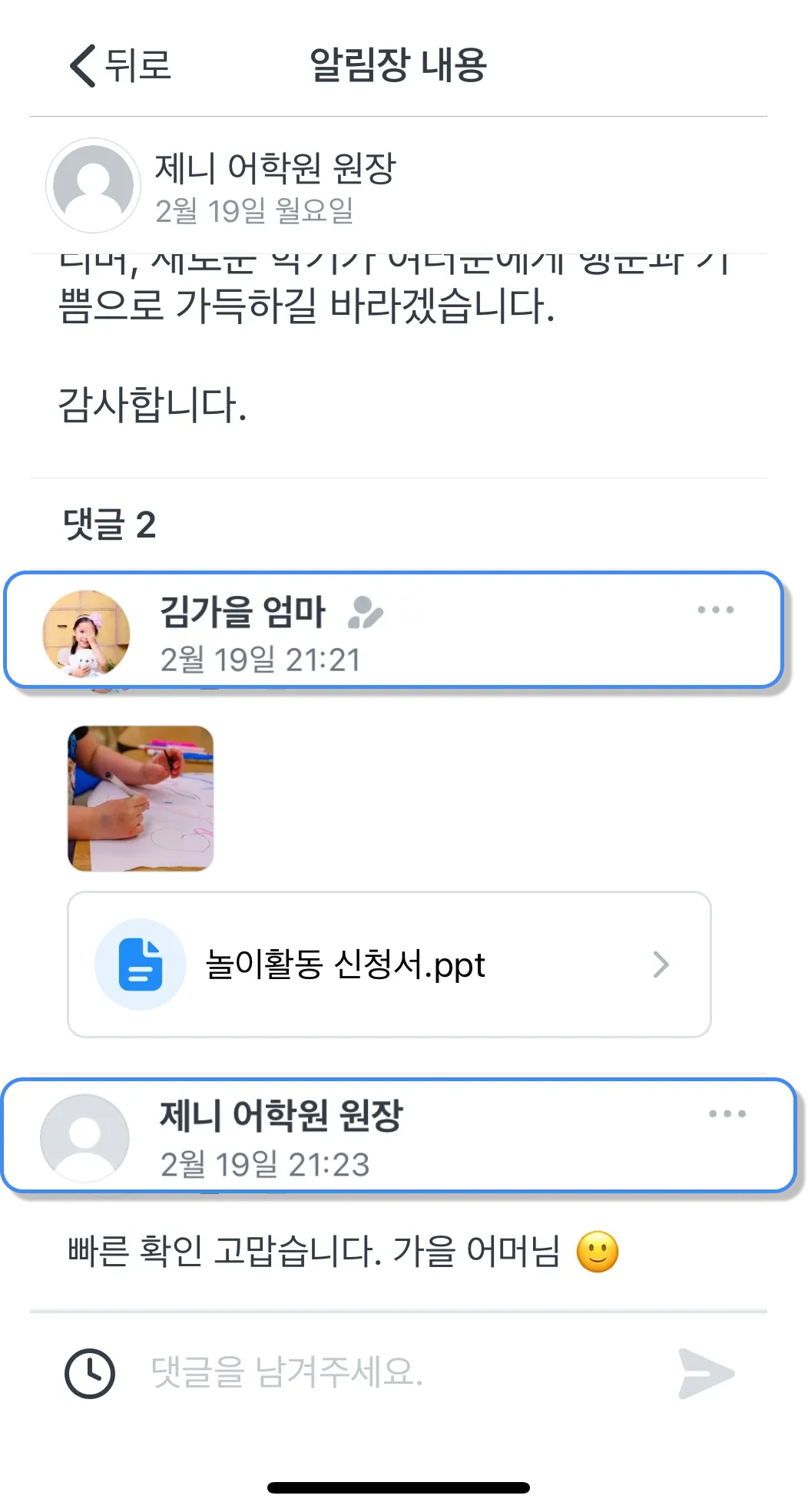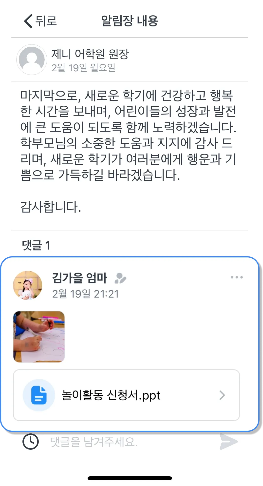 클래스노트에서 보다 편리하게 원과 학부모님들이 소통하고 학습관리 하실 수 있도록 댓글에서 파일 첨부도 가능해요.