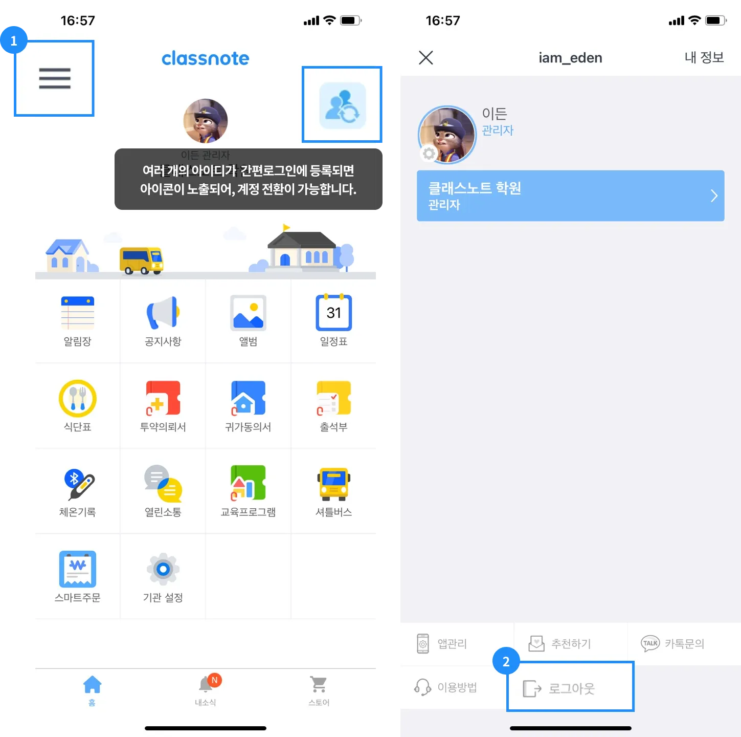 클래스노트 메인 화면에서 계정 전환 아이콘이 사라졌어요!