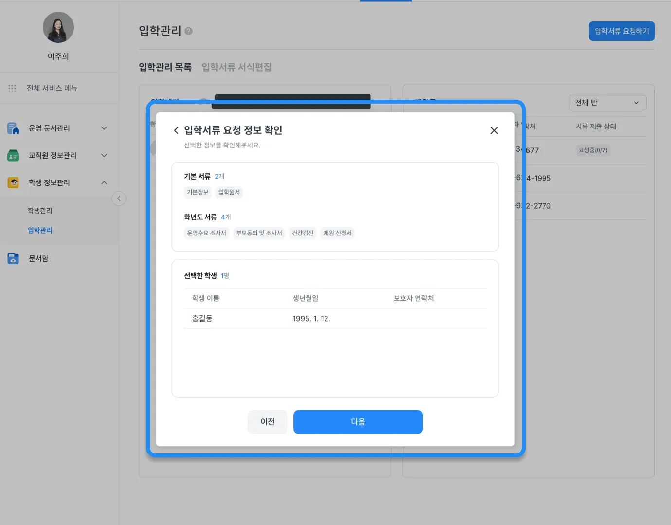 입학관리 목록에서 학생별로 요청 중인 서류가 몇 건인지 바로 확인할 수 있어요.