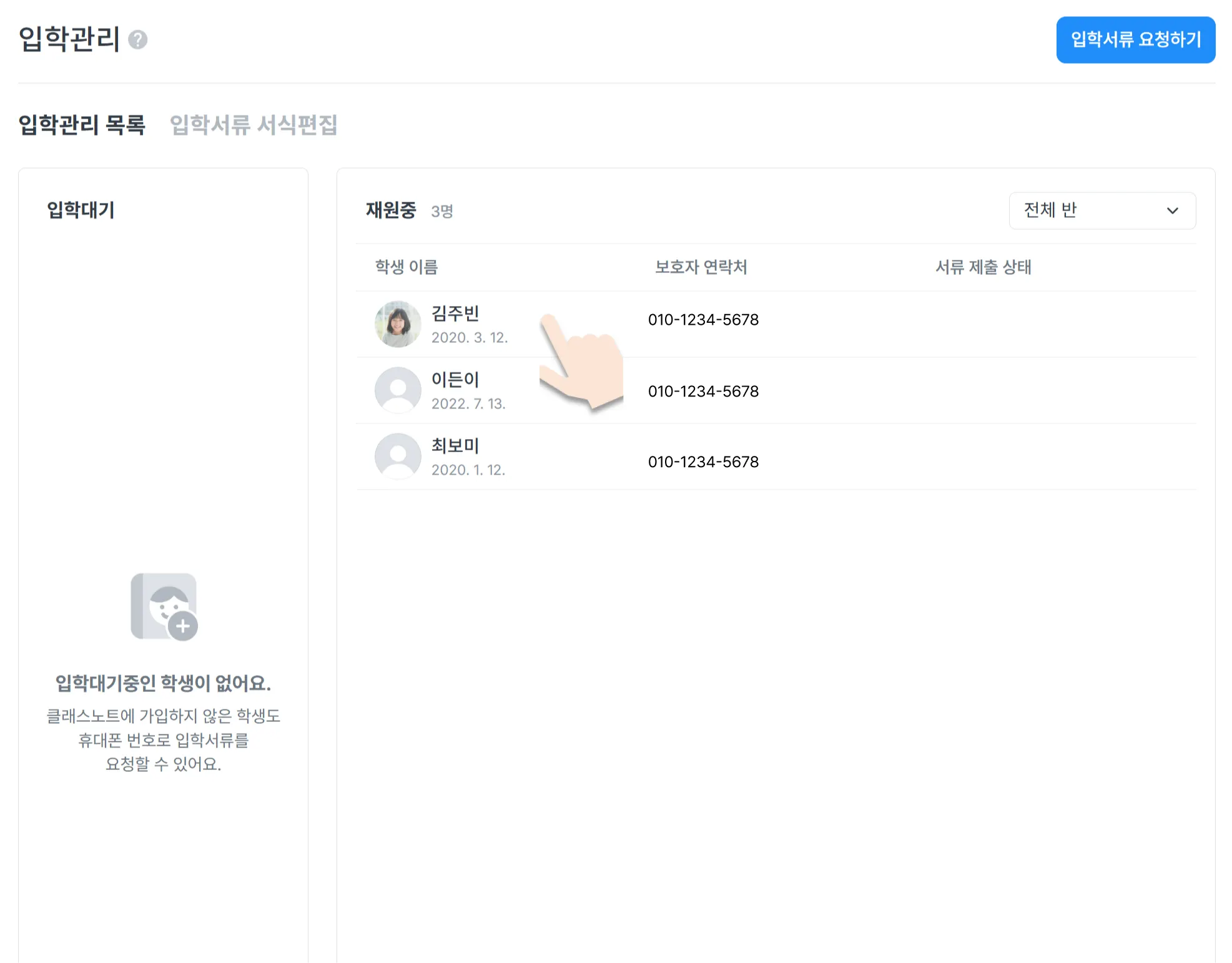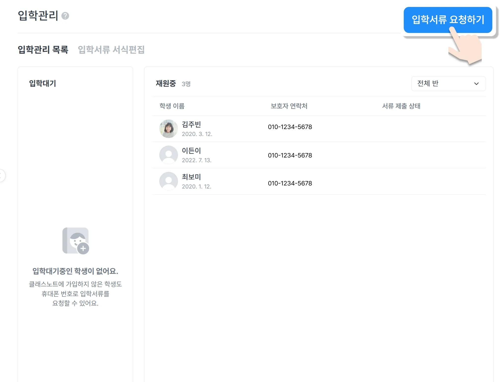 클래스노트에 가입하지지 않은 학생도 학부모 연락처만 있으면 입학서류를 요청할 수 있어요!