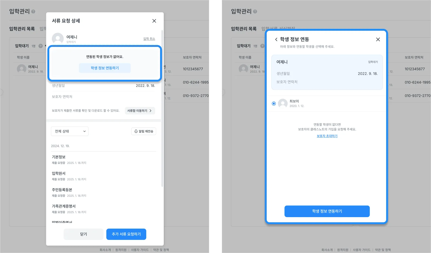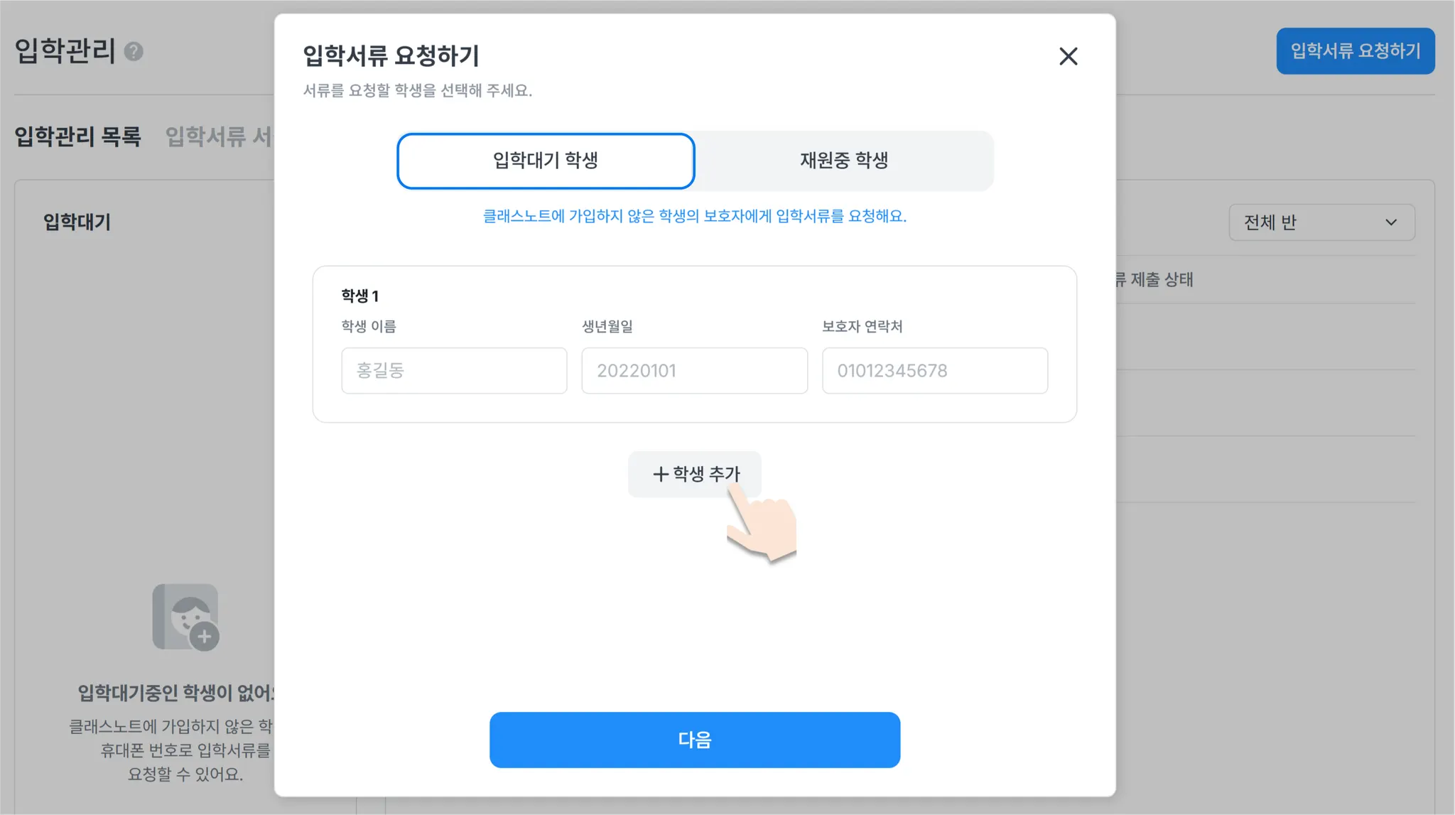클래스노트에 가입하지 않은 학생의 보호자에게 입학서류를 요청할 수 있어요!