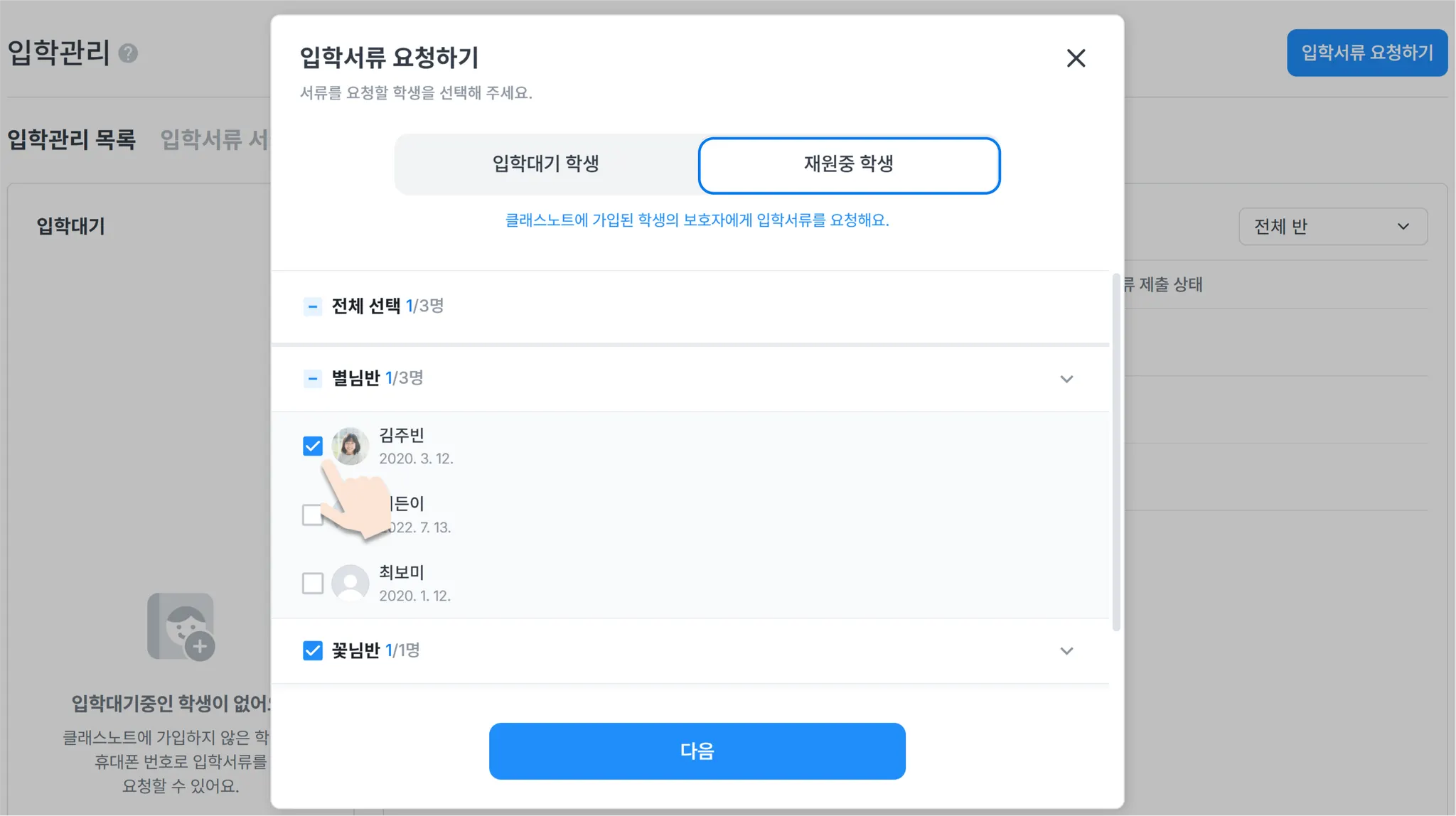 클래스노트에 등록된 학생이라면 요청할 학생을 선택해 주세요.