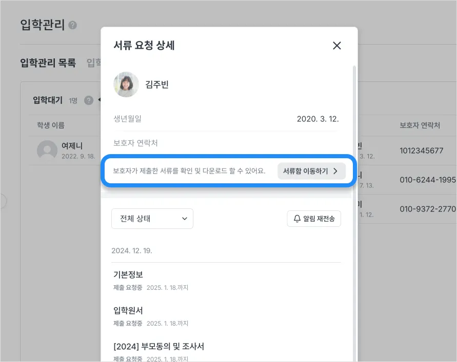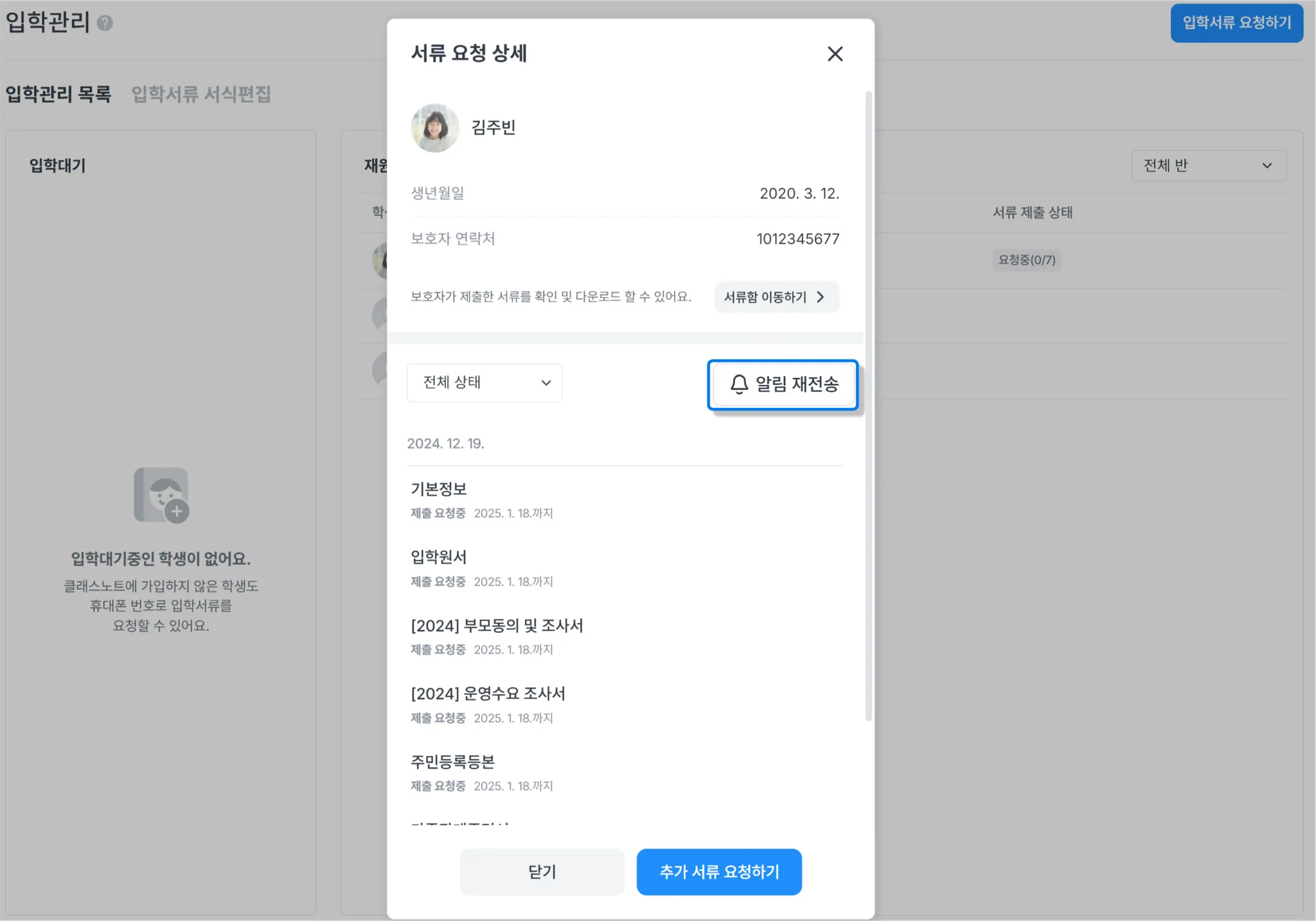 아직 제출되지 않은 서류들이 있다면, 알림 재전송버튼을 클릭하여 한번 더 학부모님께 알려주세요!