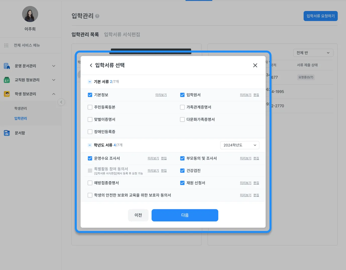 학생을 선택했다면, 필요한 입학서류를 선택해 주세요.