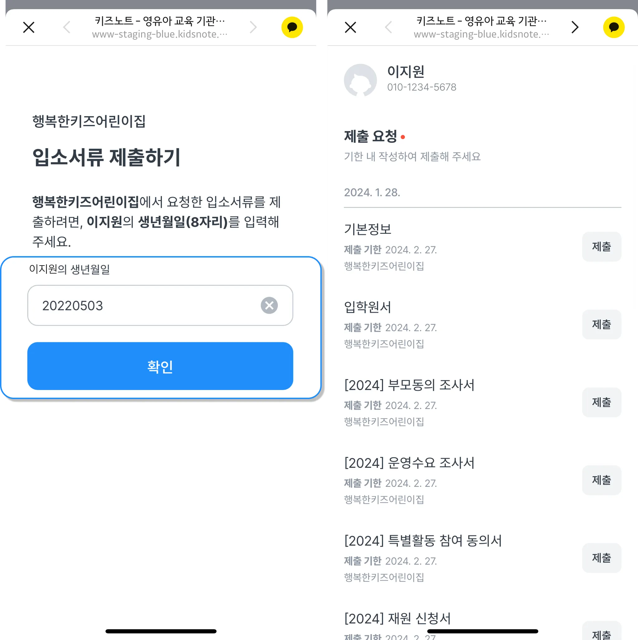 카카오 알림톡에서 서류 작성하기 버튼을 클릭하여, 학생의 생년월일을 입력하면 기관에서 요청한 서류를 확인할 수 있어요!