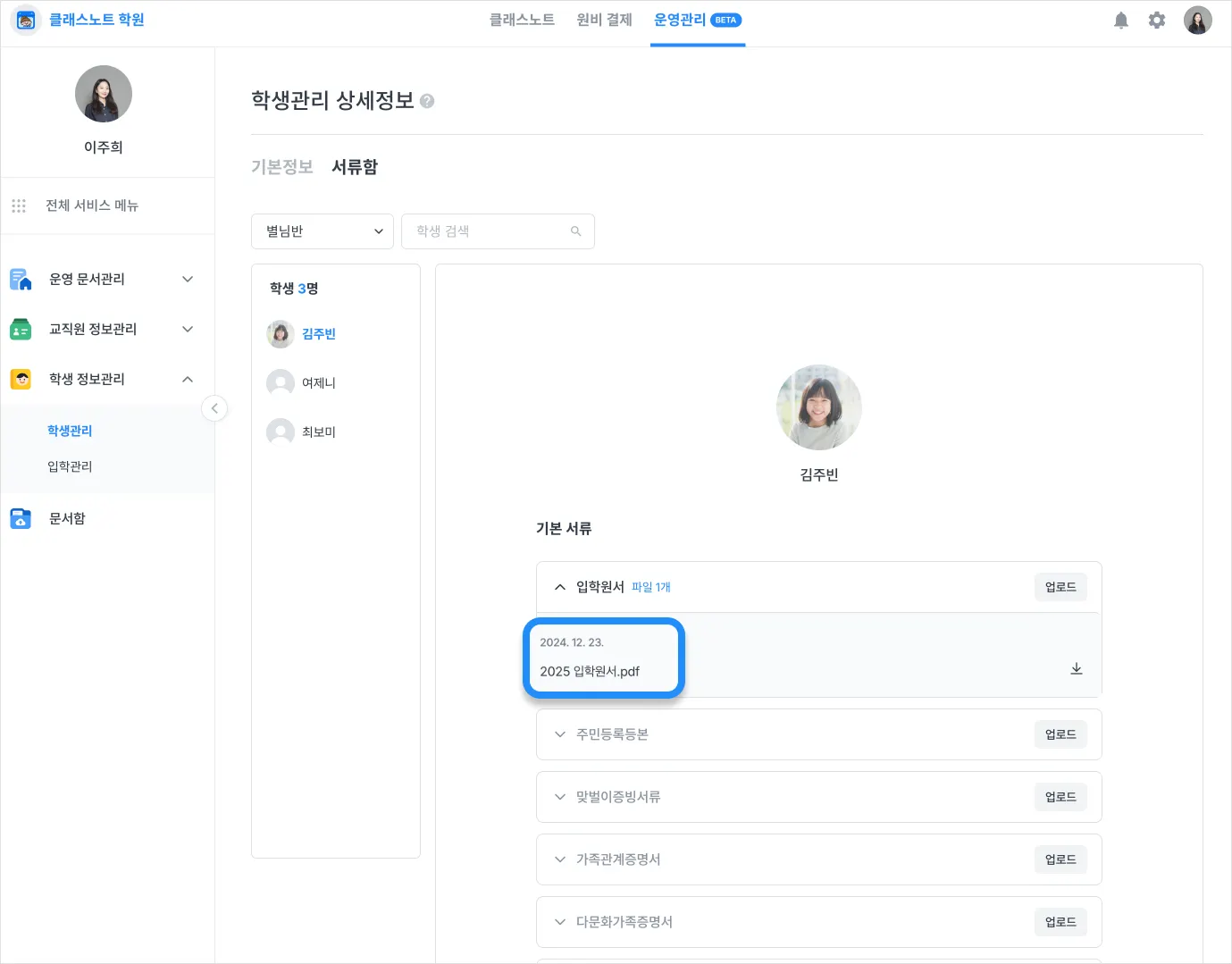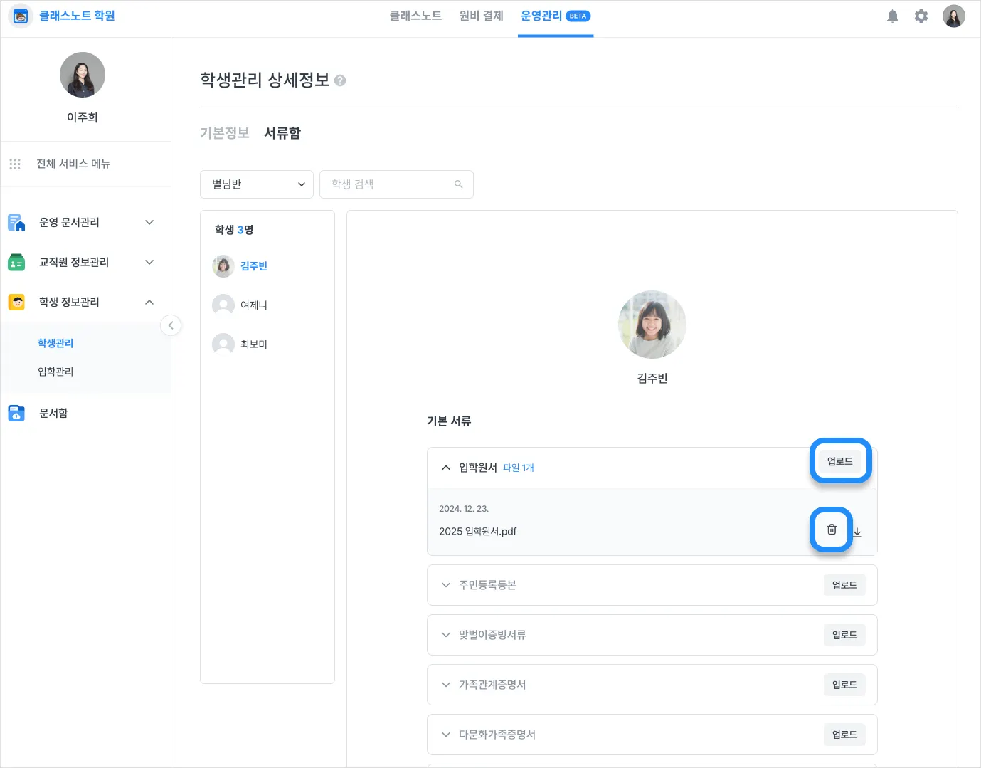 학부모님이 제출한 서류 이외의 직접 업로드하여 보관하고 싶으신 경우, 업로드 버튼을 클릭하여 파일을 업로드할 수 있습니다.