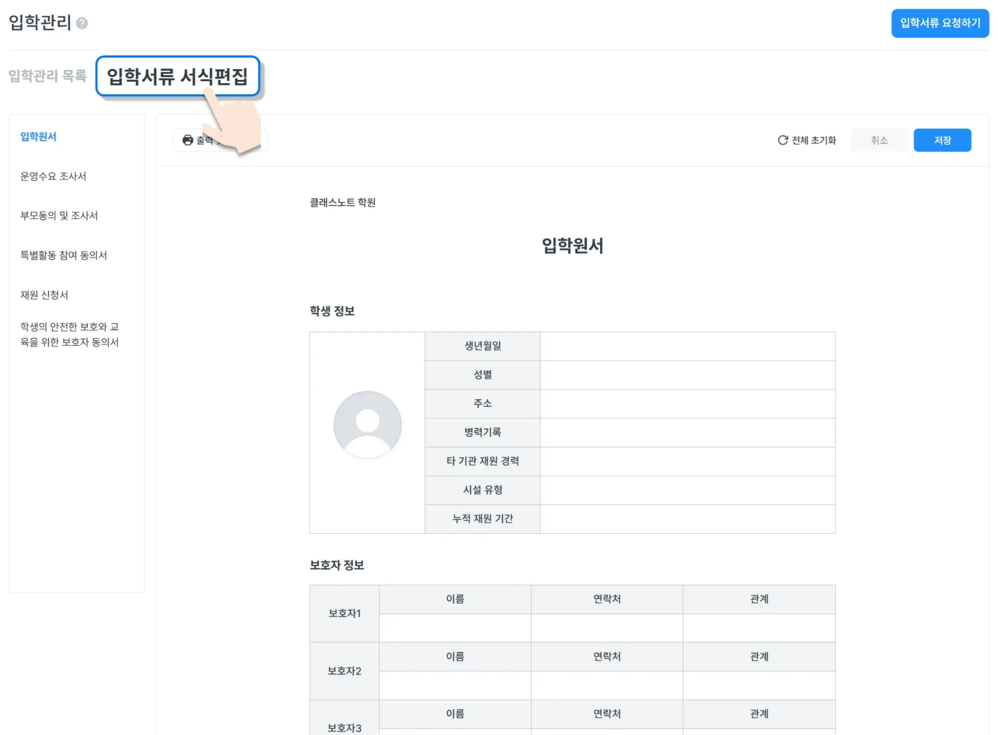 - 편집한 입학서류 서식은 저장 이후 학부모님께 요청한 입학서류부터 적용 됩니다.