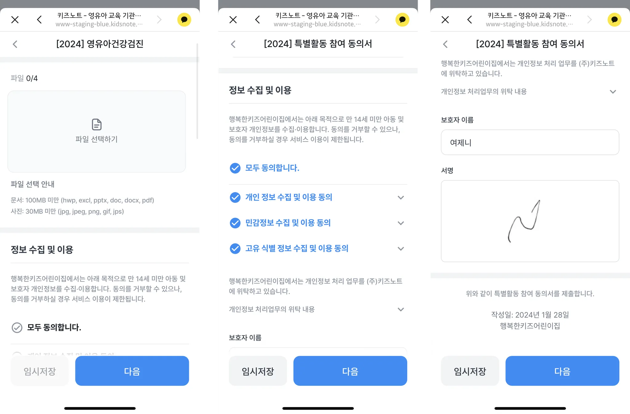 제출 서류에 따라 파일 첨부도 가능하며, 보호자 서명까지 하여 제출할 수 있어요!
