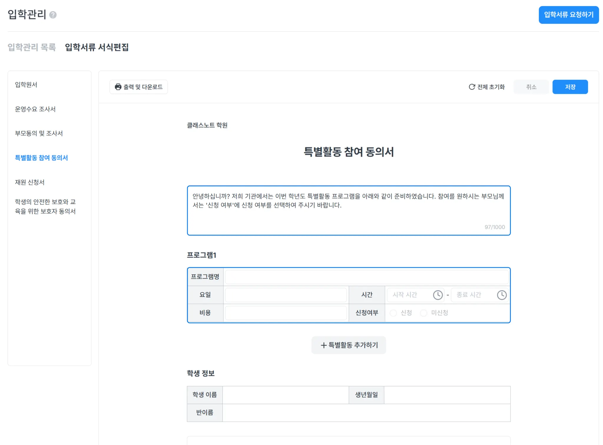 특별활동 참여 동의서는 ‘입학서류 서식편집’ 메뉴에서 프로그램을 등록 후 요청이 가능합니다.