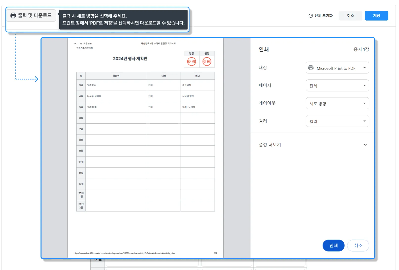 출력 및 다운로드 버튼을 클릭하면 출력하거나 PDF 파일로 다운로드할 수 있습니다.