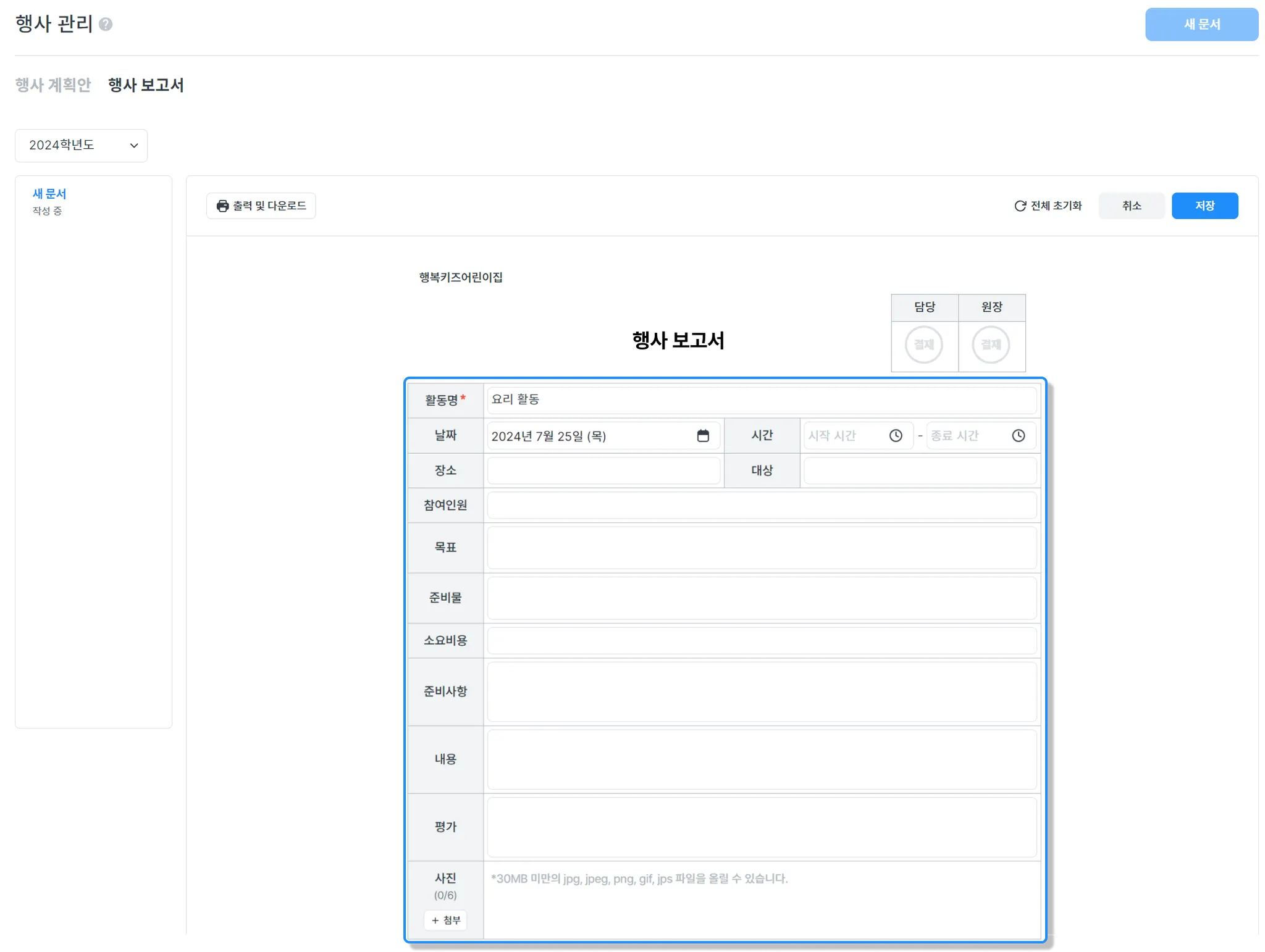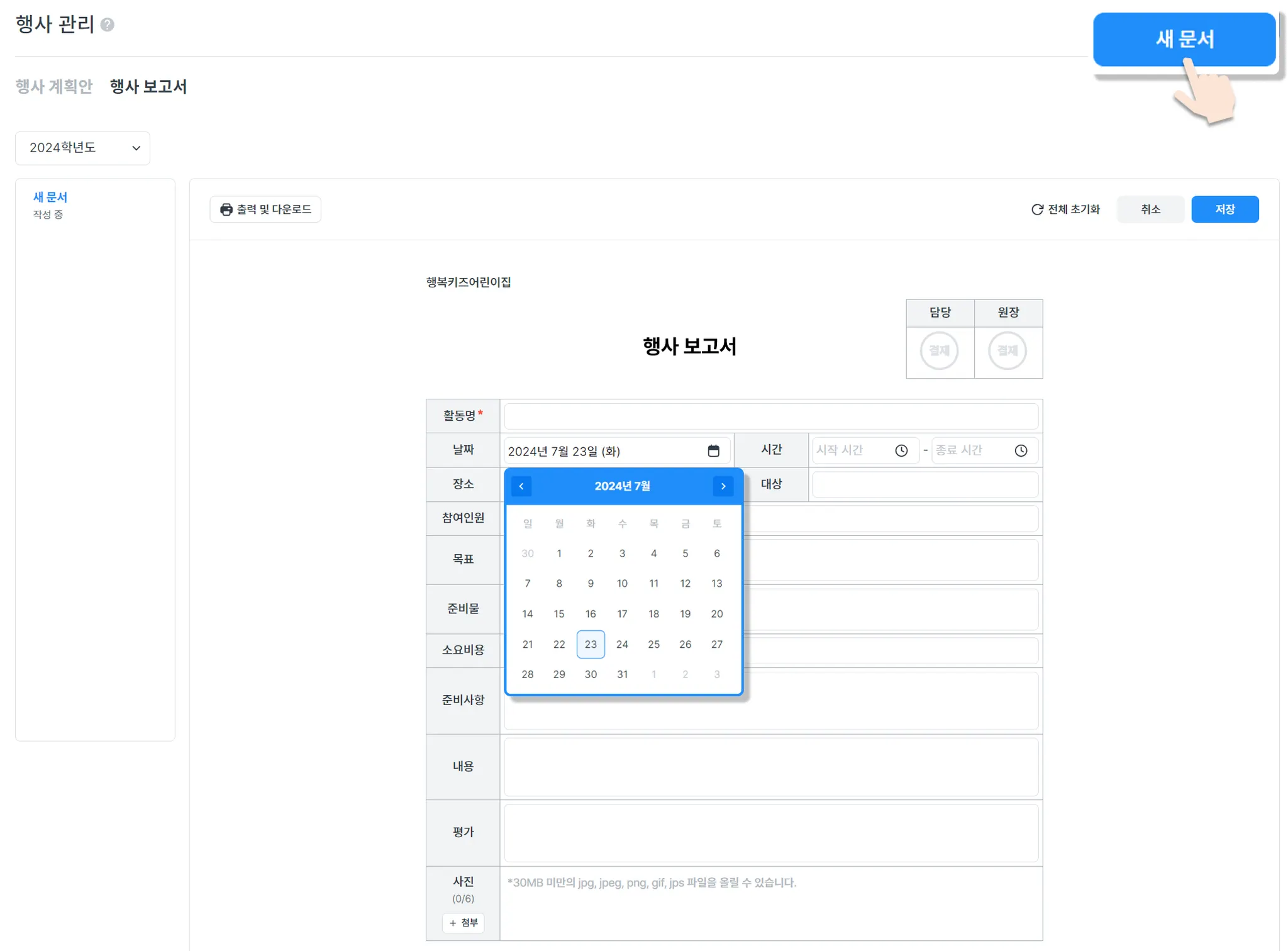 새 문서를 클릭하면, 오늘 날짜의 행사 보고서를 작성할 수 있습니다.