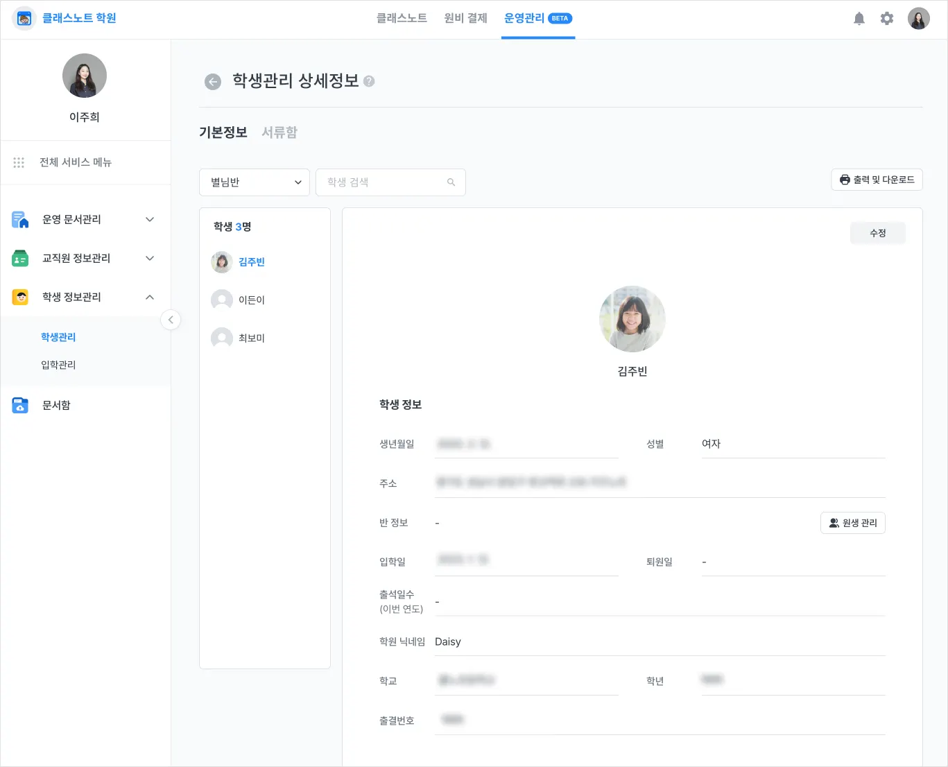 학생 명부 및 상세 정보를 입력하고 관리할 수 있어요.