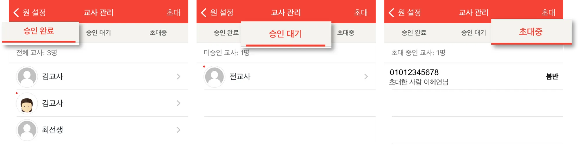 기관 설정 메뉴의 교사 관리에서 승인완료, 승인대기, 초대중 교사 목록을 확인하고 변경할 수 있습니다