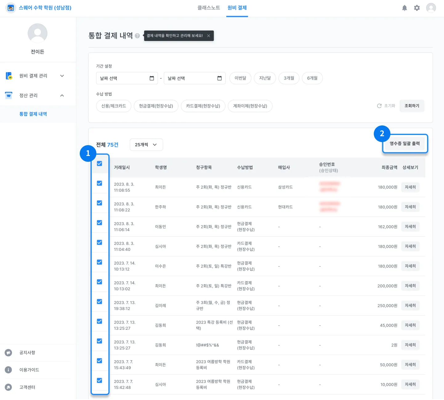 출력하고 싶은 결제 내역을 체크하여 영수증 일괄 출력 버튼을 클릭합니다.