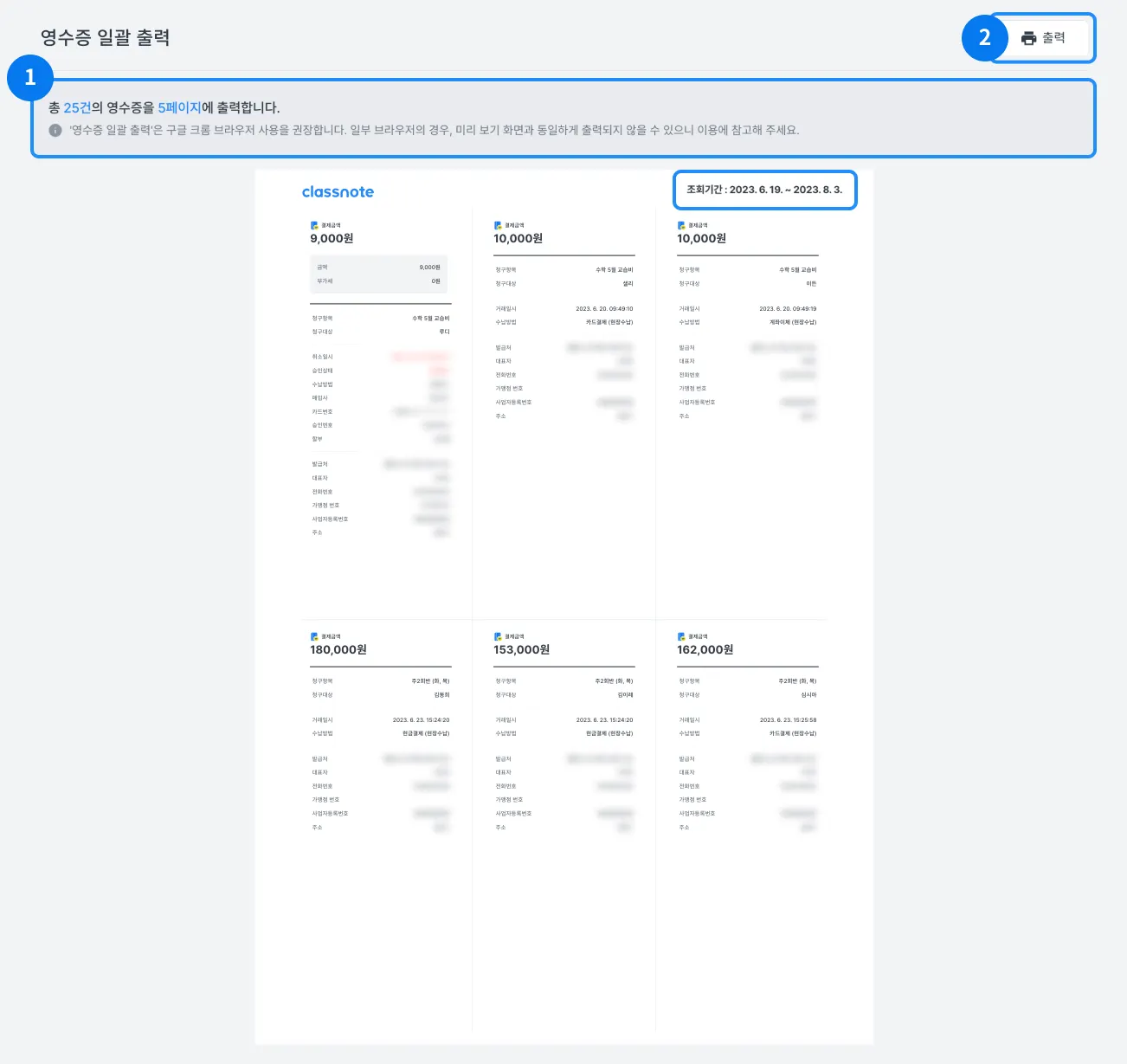 출력 화면에서 선택한 영수증을 최종 확인하신 뒤 [출력] 버튼을 눌러주세요.