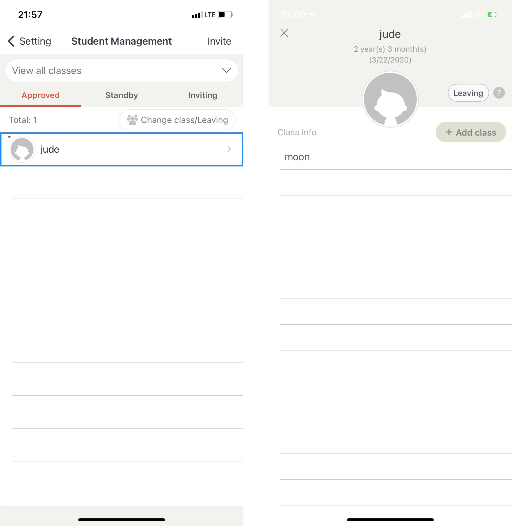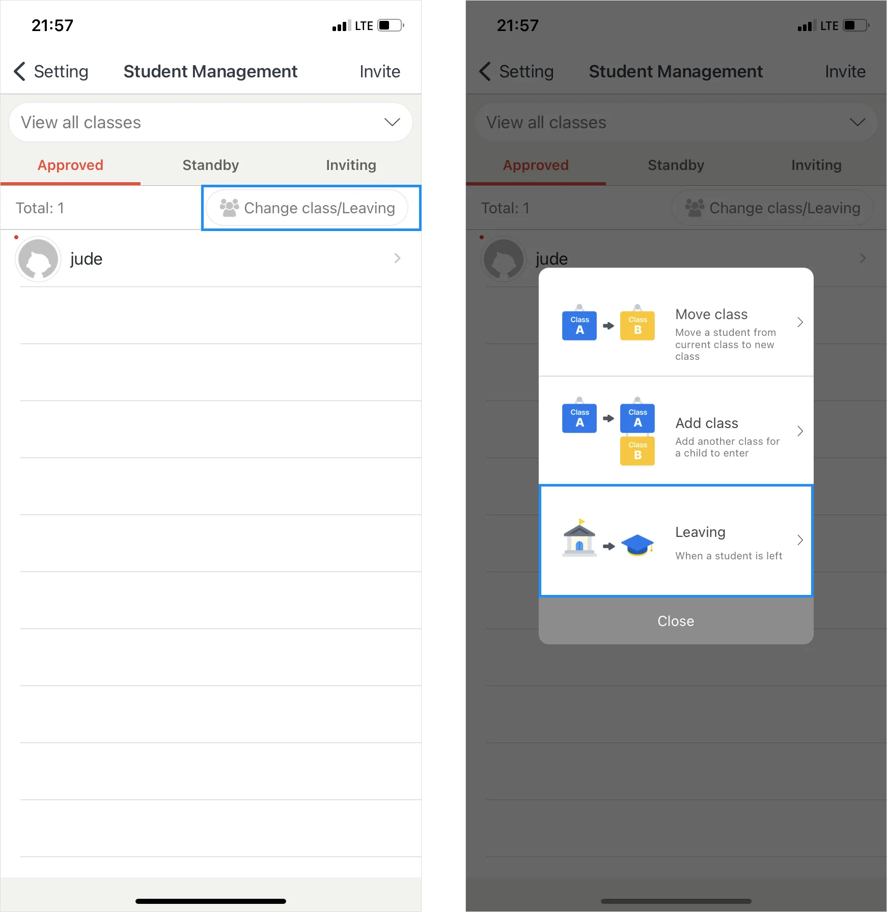 For multiple students, Student management > Change class/Leaving Studnet > Check students to be left > Click ‘Leaving’