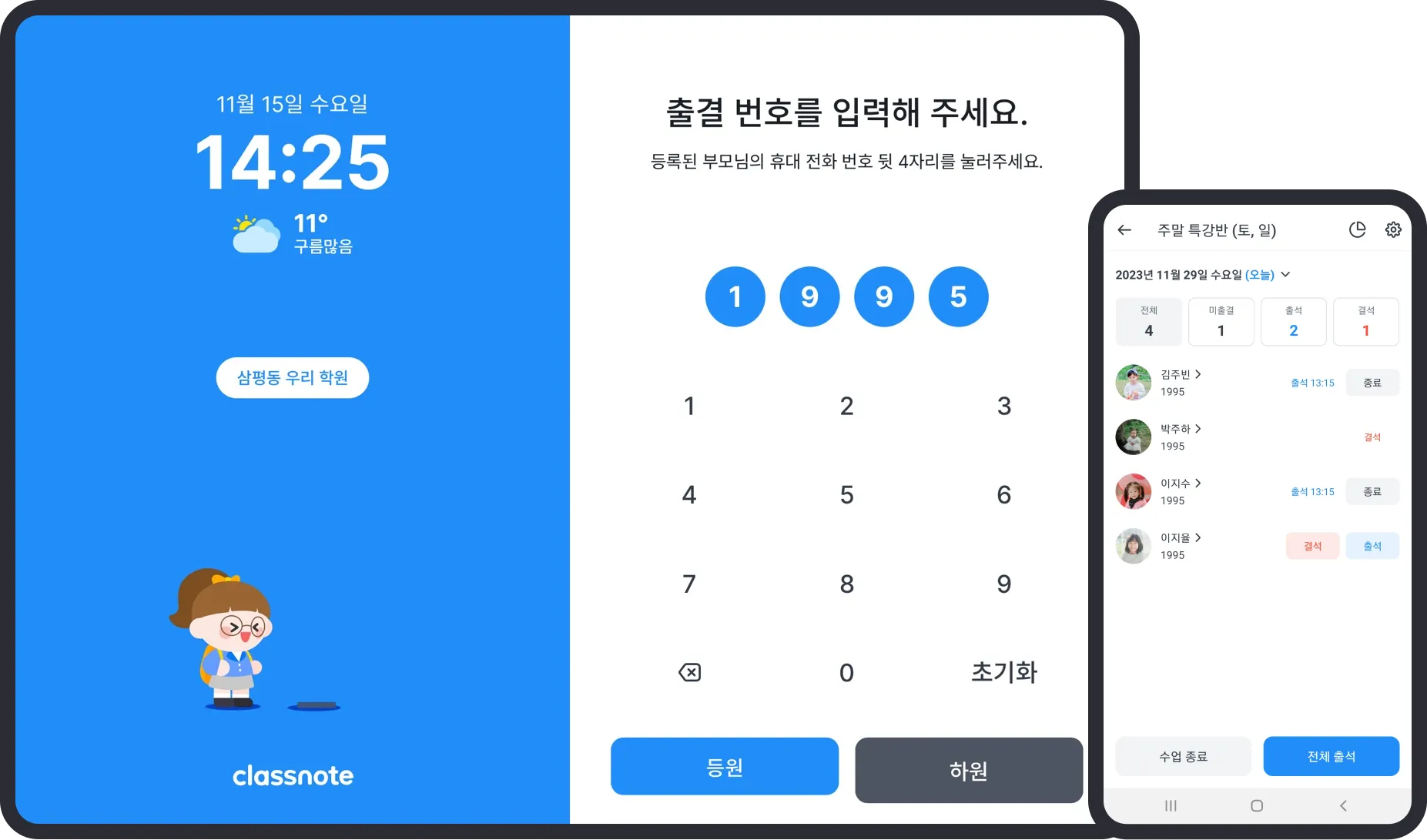키패드출결로 학생이 직접 등/하원을 입력할 수 있어요.