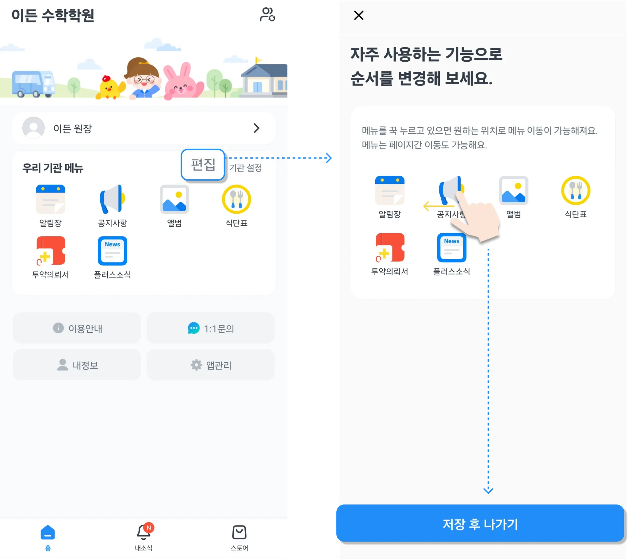 더 편리하게 사용하실 수 있도록 상단에 고정된 기관 설정과 편집기능을 사용해보세요.