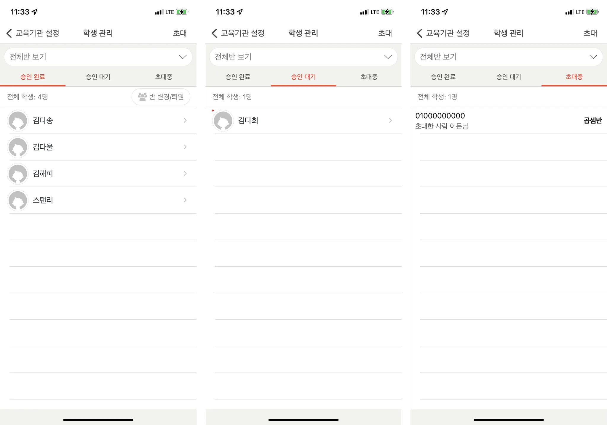 각 탭 별로 [승인 완료], [승인 대기], [초대중] 목록을 확인할 수 있습니다. 또한 우측 상단의 초대를 눌러 초대할 수 있습니다.