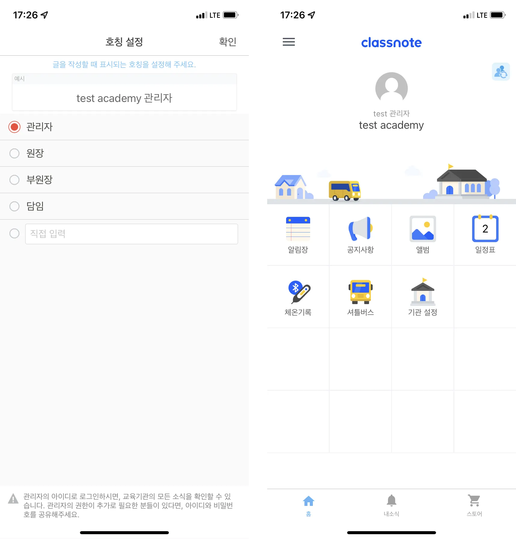 우리 교육기관의 공간이 개설되었어요! 글을 작성할 때 표시될 호칭을 설정하면 클래스노트 홈 화면으로 이동합니다.