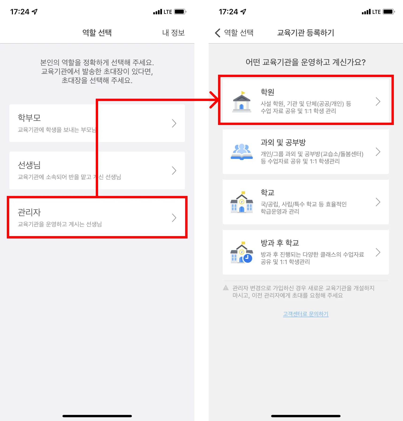 관리자 변경으로 가입하실 경우, 새롭게 교육기관을 개설하지 마시고 이전 관리자에게 관리자 초대를 요청해 주세요.