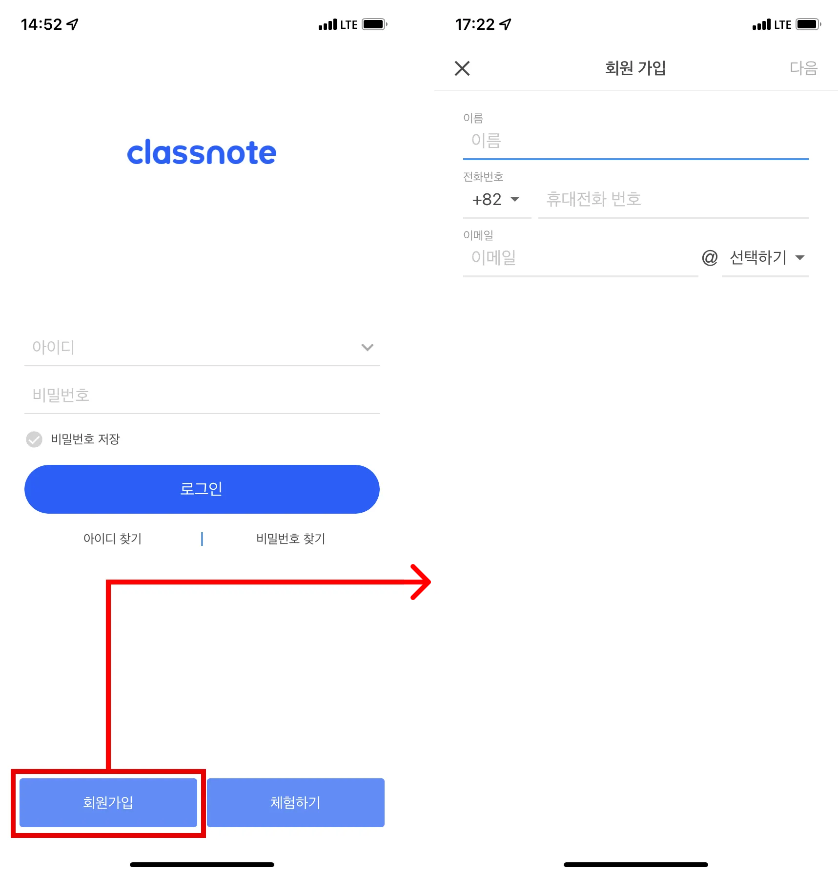 클래스노트 앱 설치 완료 후 실행하여 [회원가입]을 선택하면 이름, 전화번호, 이메일 입력 페이지로 이동합니다.