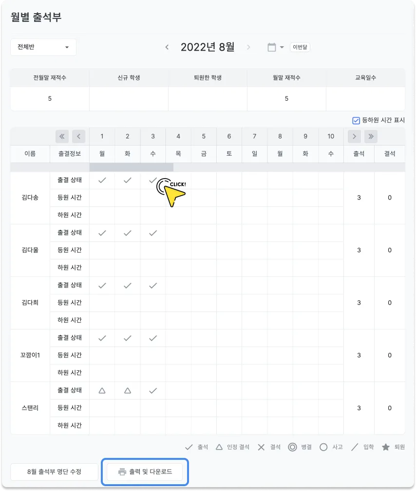 작성한 출석부는 월별, 일별로 다운받아 출력할 수 있어 업무를 효율적으로 처리할 수 있어요.
