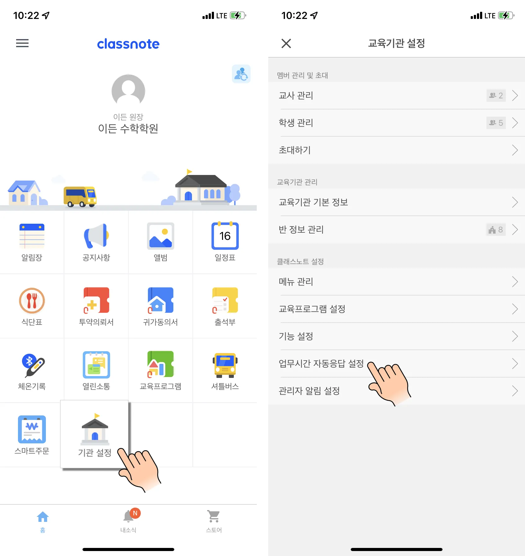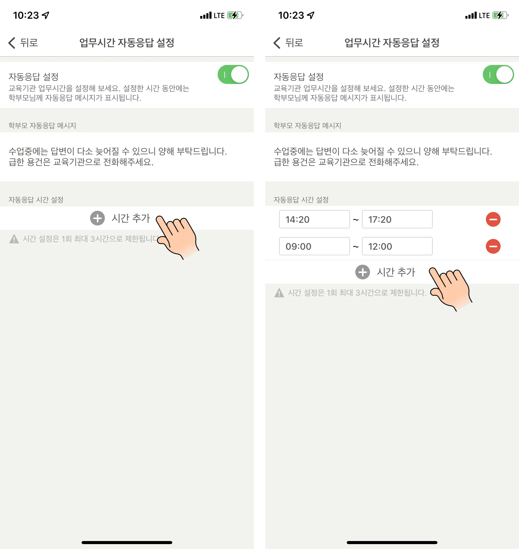 업무 시간 설정을 이용해 교육기관의 업무 시간을 설정하면 학부모님이 지정된 업무 시간에 알림장을 발송할 경우 지정 메시지가 자동 노출됩니다.