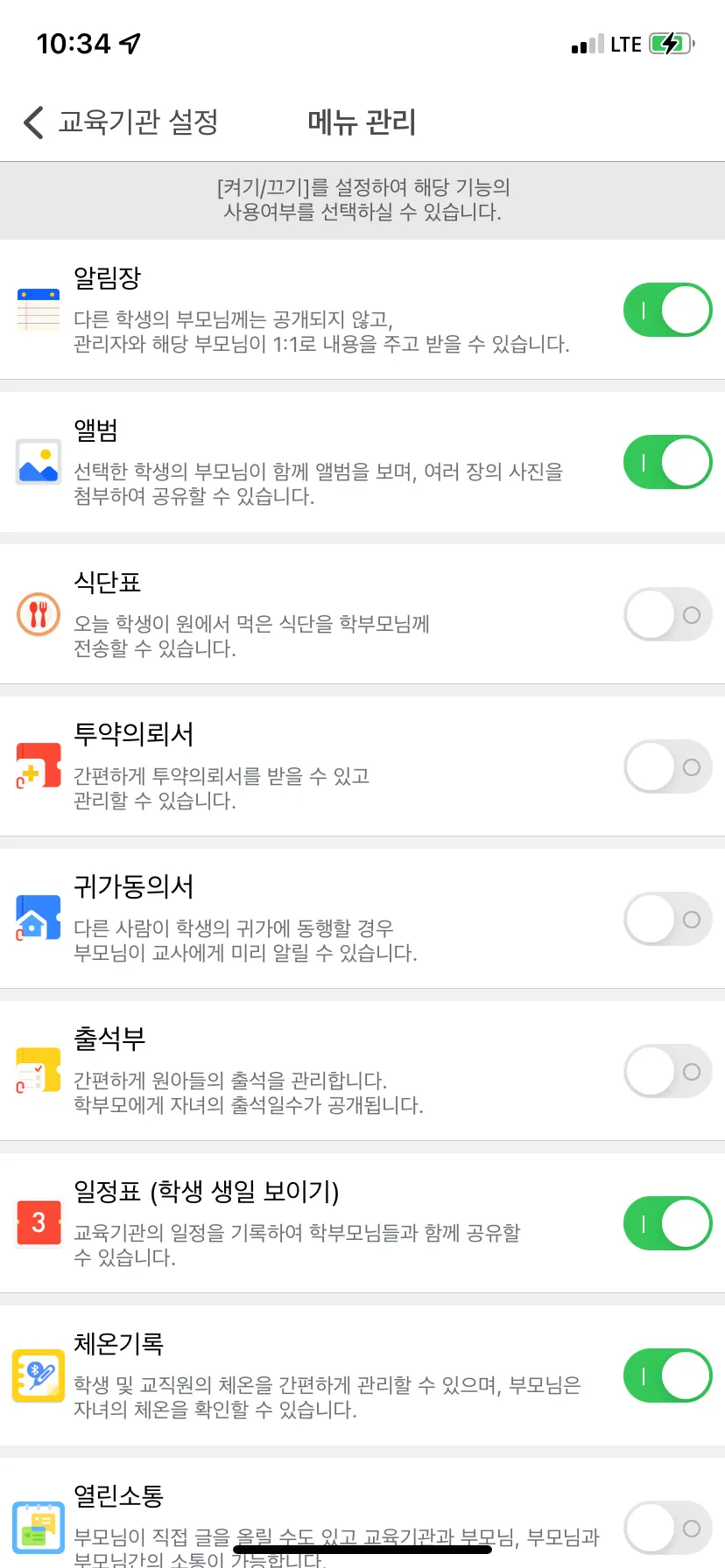 우리 교육기관에 맞게 추가기능 메뉴를 켜고 끌 수 있습니다.