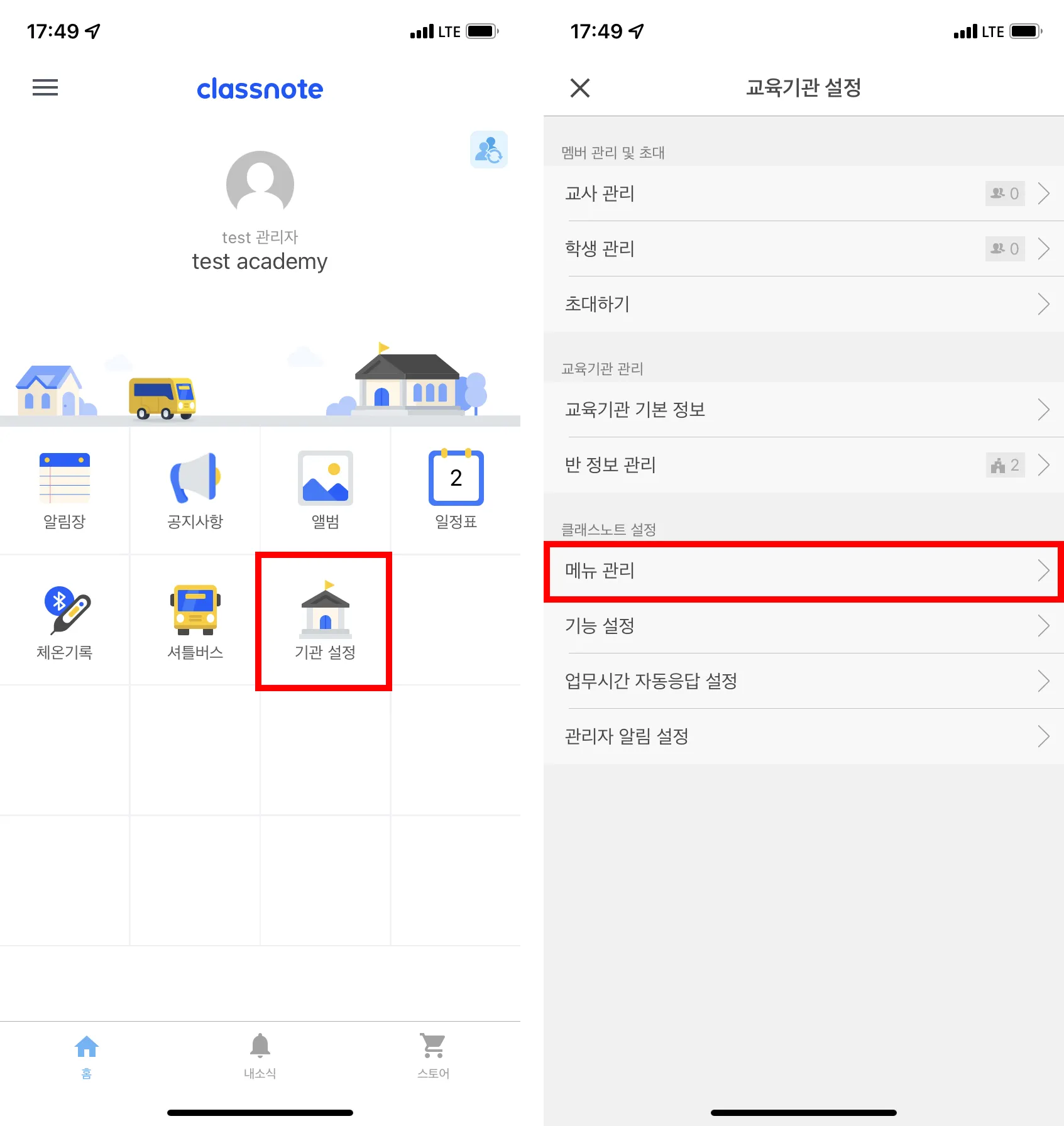 기관 설정에서 [메뉴 관리]를 선택해주세요.