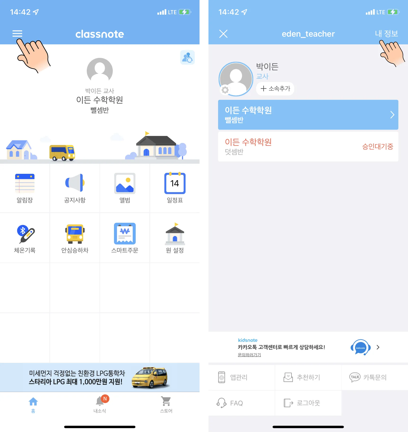 클래스노트 앱에서 좌측 상단의 [≡] 버튼을 선택한 뒤 [내 정보]를 누르면 상세 페이지로 이동합니다.