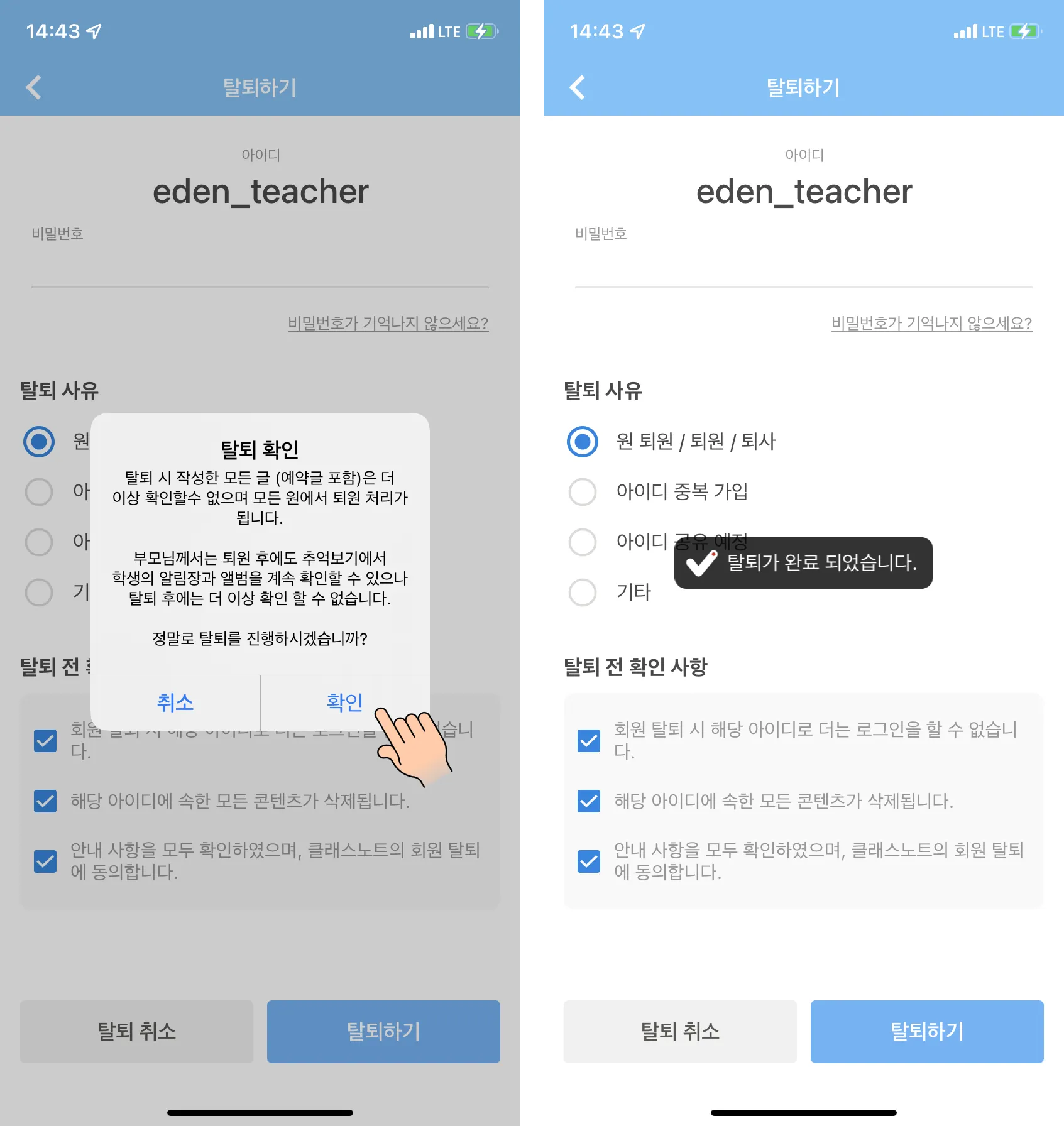 탈퇴 시 작성한 모든 글(예약글 포함)은 더 이상 확인할 수 없으며 모든 교육기관에서 퇴원처리 됩니다.