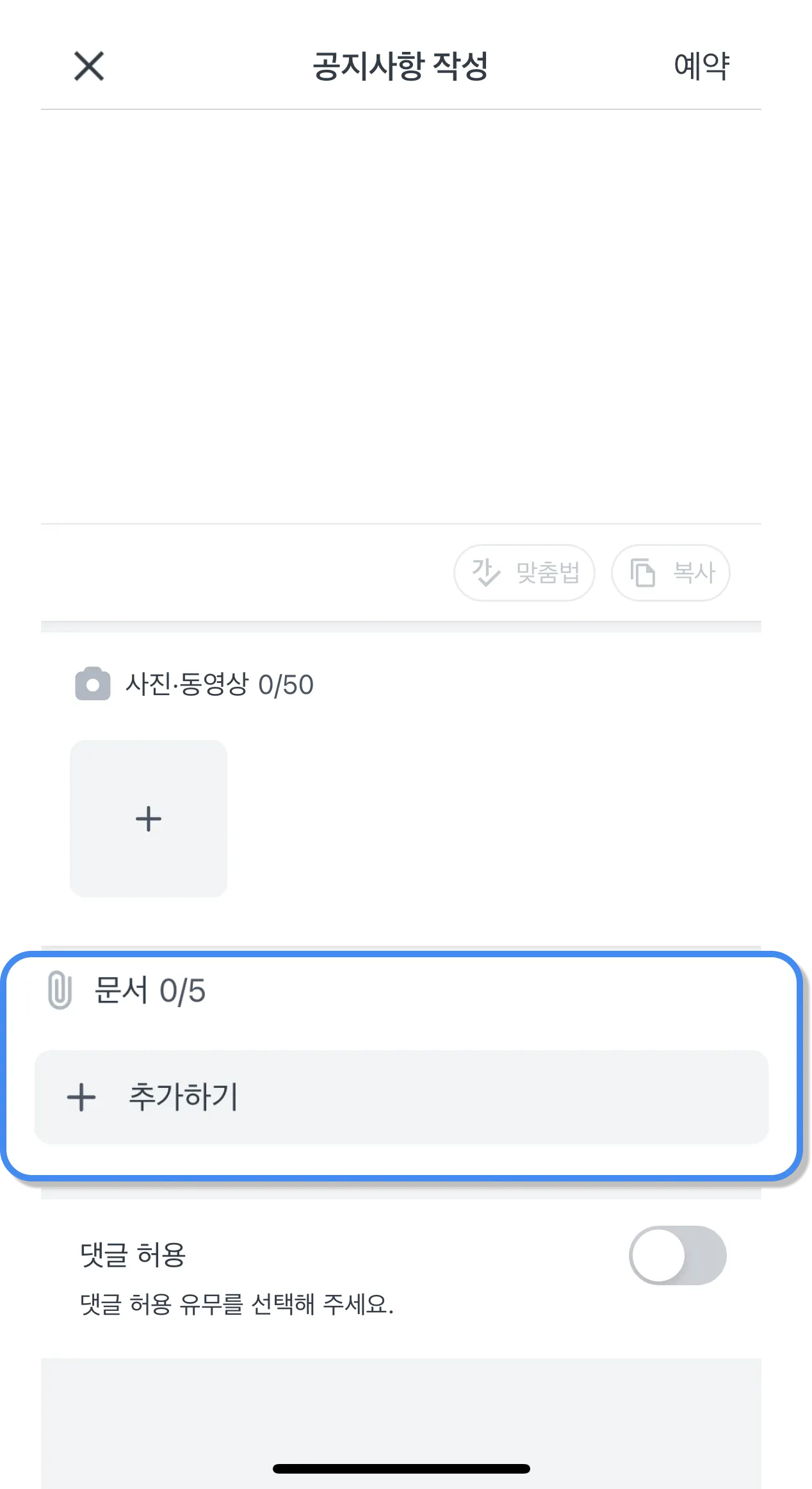 만약 공지사항 메뉴에서 문서 첨부 영역이 보이지 않으신다면, 앱이 최신 버전인지 확인해 주세요.